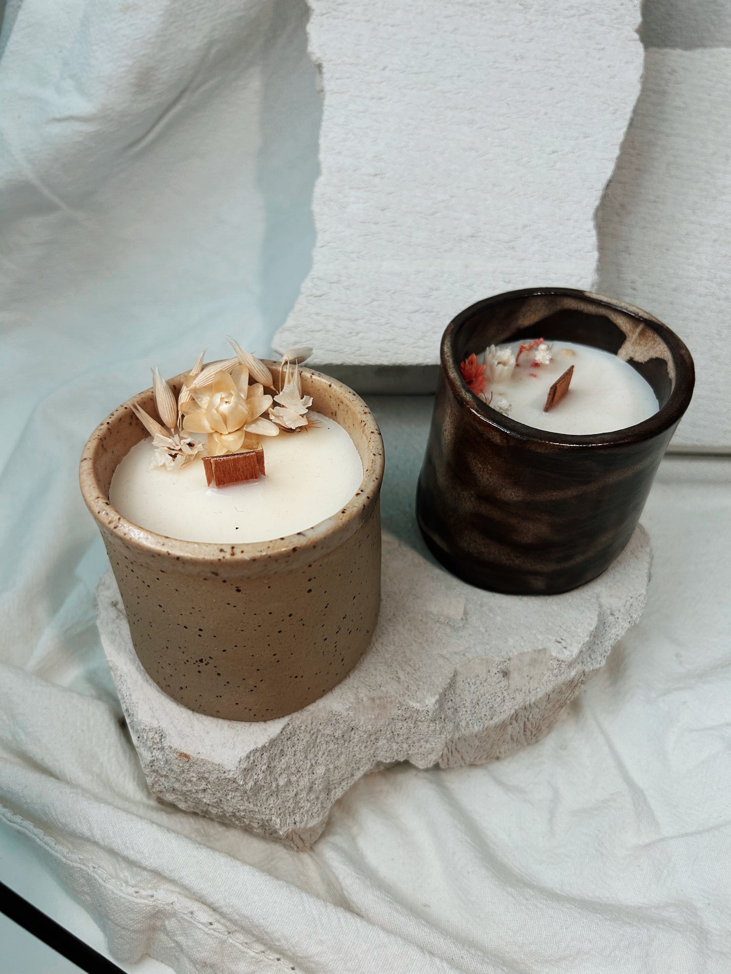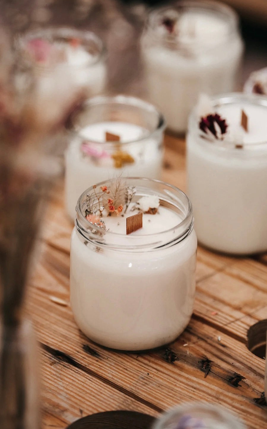 Les bougies de Carlitou parsemées de fleurs séchées sont fabriquées dans notre atelier à Liège. La cire est 100% soja et les parfums sont non toxiques.