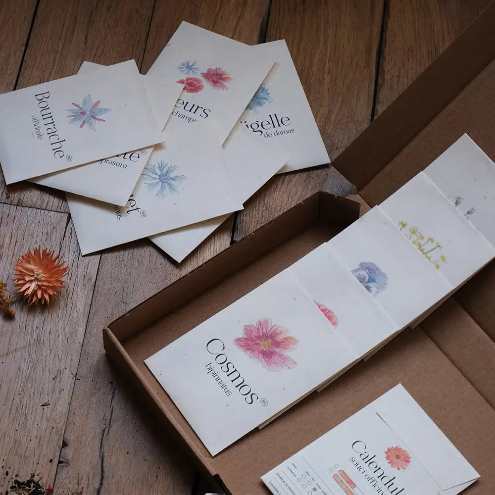 - Coffret jardinage avec 12 sachets de graines de fleurs et d’aromates